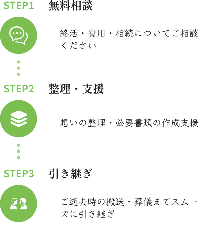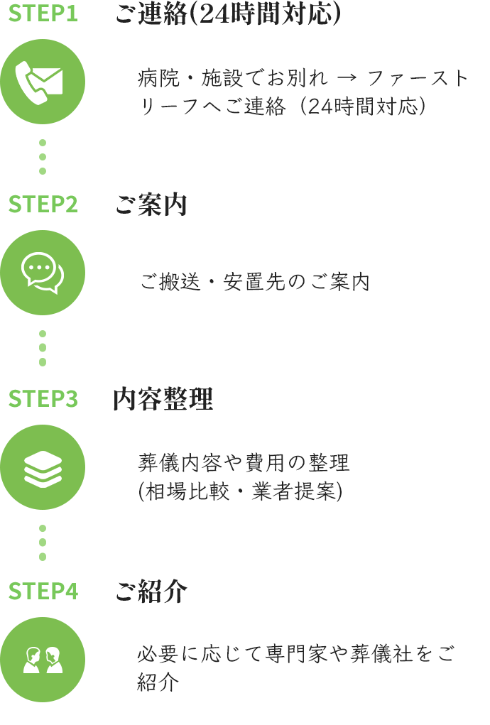 ファーストリーフは、ご家族に代わって最適な流れを整理し、必要な手配を中立的にお手伝いします。